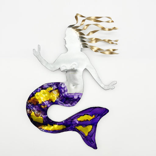 Funky metal mermaid art made from painted aluminum. 16" overall height and 9" overall width 2.5" depth. Each one is handmade and will vary sl...
