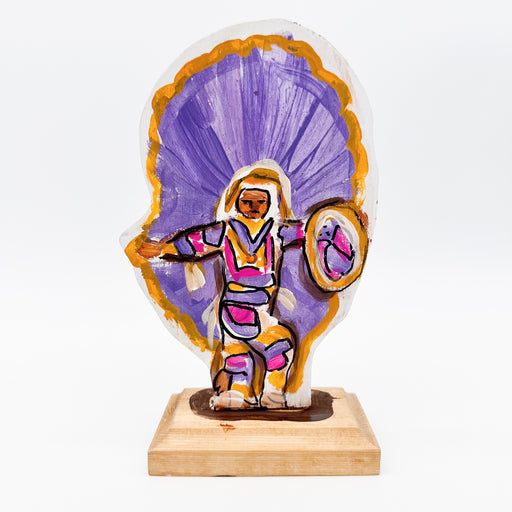 This mini Mardi Gras Indian wooden art is free-standing, hand-painted, and cut in Louisiana by renowned folk artist Lorraine Gendron. Painted on bo...