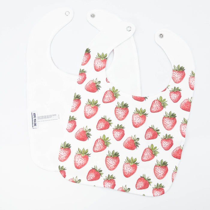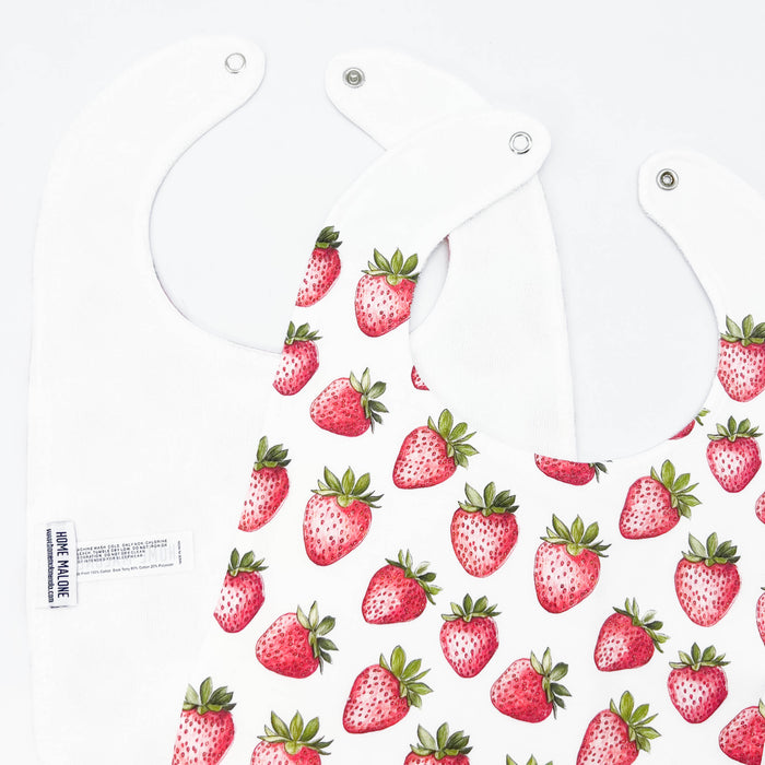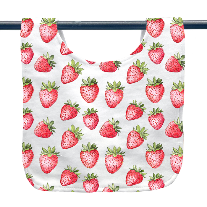 Sweeten up mealtime with this Strawberry Baby Bib, featuring a delightful all-over print of bright red strawberries and fresh green leaves on a crisp white background. Bursting with berry charm, this bib adds a fresh, fruity flair while keeping dribbles and spills in check this bib is perfect for snack time or summer days.