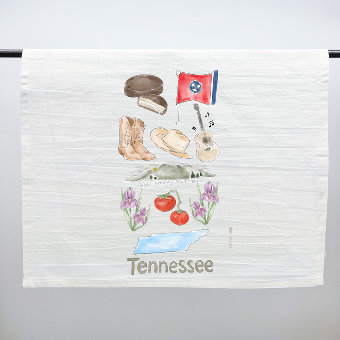 Celebrate the charm of the Volunteer State with this Tennessee Icons Tea Towel, featuring a delightful print of the state’s most beloved symbols. From Country Music, Moonpies, Iris Flowers, Tomatoes, Great Smoky Mountains, Cowboy Boots and Hat to and the iconic state flag, this towel brings a bit of Tennessee pride to your kitchen with every use.